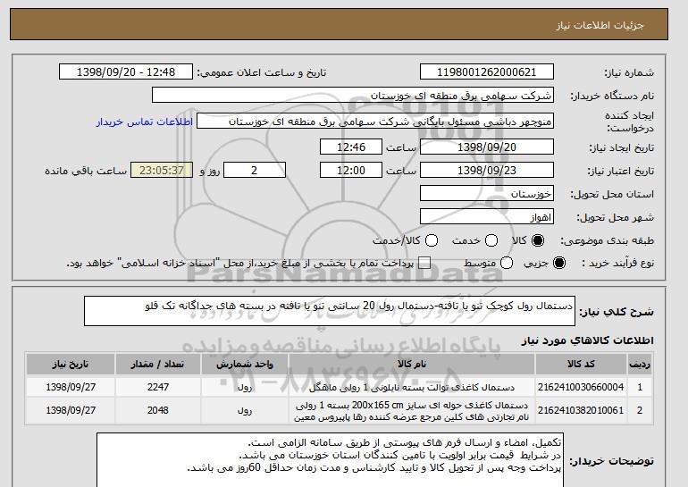 شرح کلی نیاز: دستمال رول کوچک تنو یا تافته-دستمال رول 20 سانتی تنو یا تافته در بسته های جداگانه تک قلو