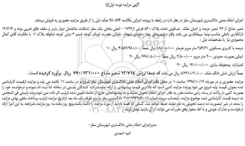 اجرای احکام مدنی دادگستری شهرستان سقز در نظر دارد در رابطه با پرونده اجرائی بکلاسه 980594 ملک ذیل را از طریق مزایده حضوری به فروش برساند.
