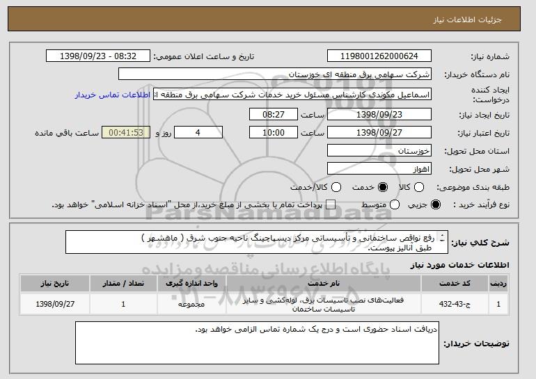 شرح کلی نیاز: رفع نواقص ساختمانی و تأسیساتی مرکز دیسپاچینگ ناحیه جنوب شرق ( ماهشهر )