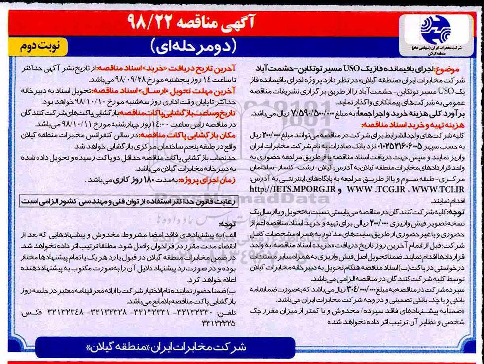 شرکت مخابرات ایران منطقه گیلان در نظر دارد پروژه اجرای باقیمانده فاز یک USO مسیر توتکابن - حشمت آباد را از طریق برگزاری تشریفات مناقصه عمومی به شرکتهای پیمانکاری واگذار نماید.