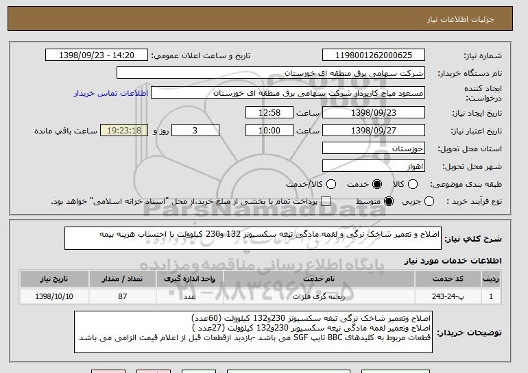 شرح کلی نیاز: اصلاح و تعمیر شاخک نرگی و لقمه مادگی تیغه سکسیونر 132 و230 کیلوولت با احتساب هزینه بیمه