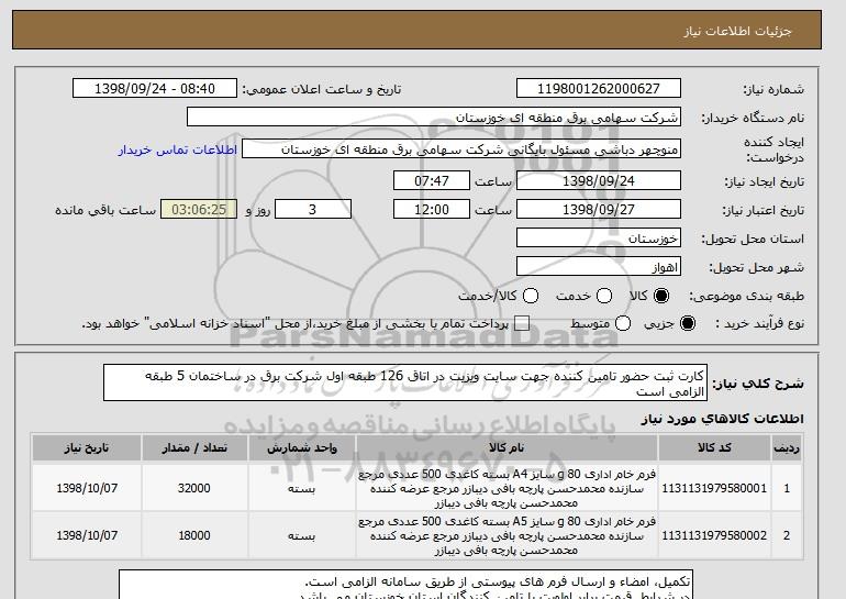 شرح کلی نیاز: کارت ثبت حضور تامین کننده جهت سایت ویزیت در اتاق 126 طبقه اول شرکت برق در ساختمان 5 طبقه الزامی است