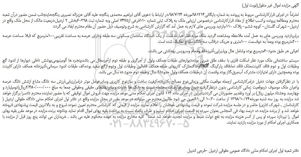 با در نظرگرفتن جهات دخیل درامرکارشناسی ازجمله موقعیت مکانی وزمانی،نوع مصالح بکاررفته،کیفیت ساخت و ساز،نوع کاربری وسایرعوامل موثر درامرارزیابی،ارزش سه دانگ مشاع ازشش دانگ عرصه واعیان ملک موصوف درموقعیت زمانی کارشناسی بدون درنظرگرفت دیون وسایرعوارضات محتمله نسبت به بانک ها ،ادارات وسایرنهادهای حقیقی وحقوقی جمعا به مبلغ 2/480/000/000ریال(دومیلیارد و چهارصد وهشتاد میلیون ریال) بر آورد وتقدیم حضورتان می گردد.بنابراین در اجرای ماده 114 قانون اجرای احکام مدنی موعد مزایده جهت فروش اموال توقیفی که با حضور نماینده محترم دادسرا برگزار خواهد شد مزایده به روز سه شنبه مورخه1398/10/24 از ساعت 10.30 الی 11تعیین می شود طالبین محترم می میتوانند در موعد مقرر در محل مزایده واقع در دفتر اول اجرای احکام مدنی دادگاه حقوقی اردبیل ( کارشناسان ـ شهرک اداری) حاضر و در جلسه مزایده شرکت نموده و قیمت پیشنهادی خودشان را اعلام نمایند مزایده از قیمتی که کارشناس محترم تعیین نموده شروع و به بالاترین قیمت پیشنهادی فروخته خواهد شد و از برنده مزایده ده درصد بهاء فی المجلس بعنوان سپرده به قسمت اجرای احکام تسلیم و ظرف یکماه نسبت به پرداخت بقیه بهای اموال اقدام نماید چنانچه برنده مزایده در موعد مقرر بقیه بهای اموال را نپردازد سپرده او پس از کسر هزینه مزایده به نفع دولت ضبط و مزایده تجدید خواهد شد ضمنا" کلیه مخارج مزایده به عهده محکوم علیه می باشد . خریداران می توانند پنج روز قبل از مزایده با همکاری اجرای احکام از مورد مزایده بازدید نمایند.
