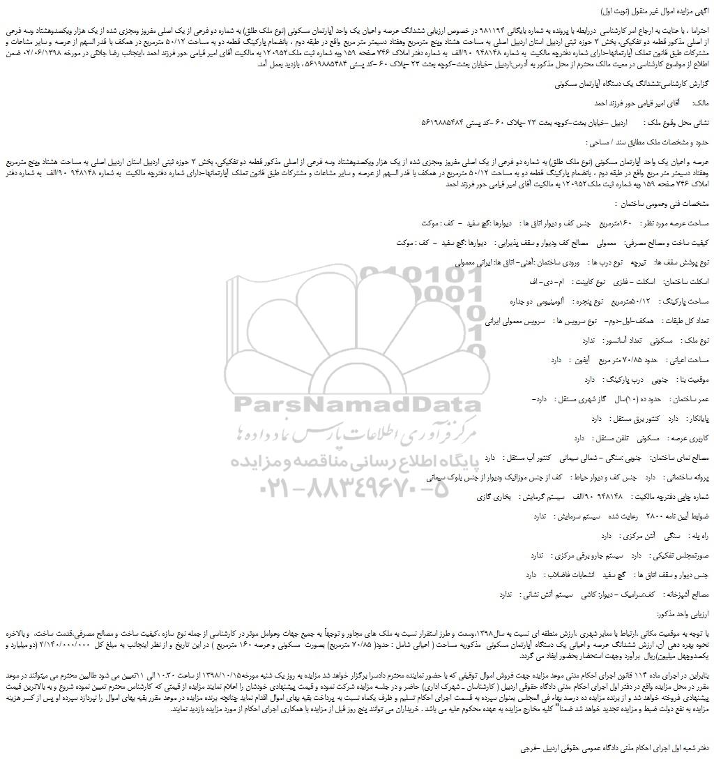 عرصه و اعیان یک واحد آپارتمان مسکونی (نوع ملک طلق) به شماره دو فرعی از یک اصلی مفروز ومجزی شده از یک هزار ویکصدوهشتاد وسه فرعی از اصلی مذکور قطعه دو تفکیکی، بخش 3 حوزه ثبتی اردبیل استان اردبیل اصلی به مساحت هشتاد وپنج مترمربع وهفتاد دسیمتر متر مربع واقع در طبقه دوم ، بانضمام پارکینگ قطعه دو به مساحت 50/12 مترمربع در همکف با قدر السهم از عرصه و سایر مشاعات و مشترکات طبق قانون تملک آپارتمانها-دارای شماره دفترچه مالکیت به شماره 948148 90/الف به شماره دفتر املاک 746 صفحه 159 وبه شماره ثبت ملک120952 به مالکیت آقای امیر قیامی حور فرزند احمد