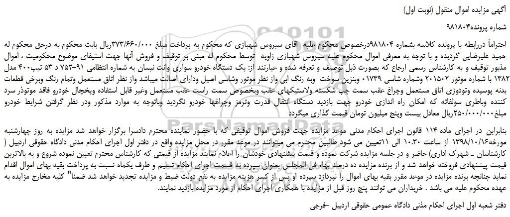 احتراماً دررابطه با پرونده کلاسه بشماره 981804درخصوص محکوم علیه  اقای سیروس شهبازی که محکوم به پرداخت مبلغ 373/660/000ریال بابت محکوم به درحق محکوم له حمید علیرضایی گردیده و با توجه به معرفی اموال محکوم علیه سیروس شهبازی زاویه  توسط محکوم له مبنی بر توقیف و فروش آنها جهت استیفای موضوع محکومیت ، اموال مذبور توقیف و به کارشناس رسمی ارجاع که بصورت ذیل توصیف و تعرفه شده و عبارتند از: یک دستگاه خودرو سواری وانت نیسان به شماره انتظامی 91-752 د 53 تیپ400 مدل 1382 با شماره موتور 201502 وشماره شاسی 01739 وبنزین سوخت  وبه رنگ ابی واز نظر موتور وشاسی اصیل ودارای اصالت میباشد واز نظر اتاق مستعمل وتمام رنگ وبرخی قطعات بدنه پوسیده وتودوزی اتاق مستعمل وچراغ عقب سمت چپ شکسته ولاستیکهای عقب وبخصوص سمت راست عقب مستعمل وغیر قابل استفاده ویخچال خودرو فاقد موتوذر سرد کننده وباطری سولفاته که امکان راه اندازی خودرو جهت بازدید دستگاه انتقال قدرت وترمز وچراغها خودرو نگردید وباتوجه به موارد مذکور ودر نظر گرفتن شرایط خودرو مبلغ250/000/000ریال معادل بیست وپنج میلیون تومان قیمت گذاری میگردد