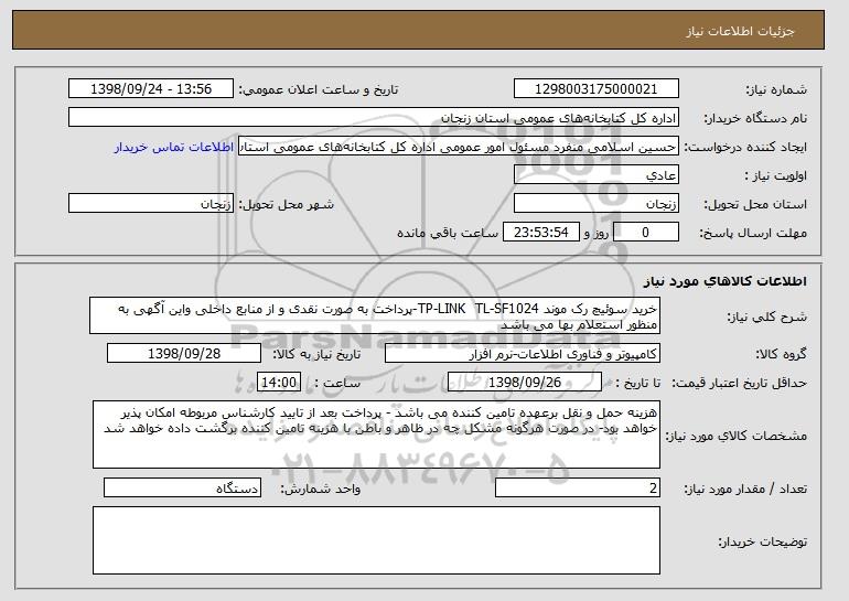 شرح کلی نیاز: خرید سوئیچ رک موند TP-LINK TL-SF1024-پرداخت به صورت نقدی و از منابع داخلی واین آگهی به منظور استعلام بها می باشد