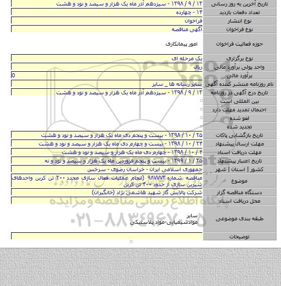 مناقصه شماره ۹۸۷۷۷۳ (انجام عملیات فعال سازی مجدد ۲۰۰ تن کربن واحدهای شیرین سازی از حدود ۴۰۰ تن کربن