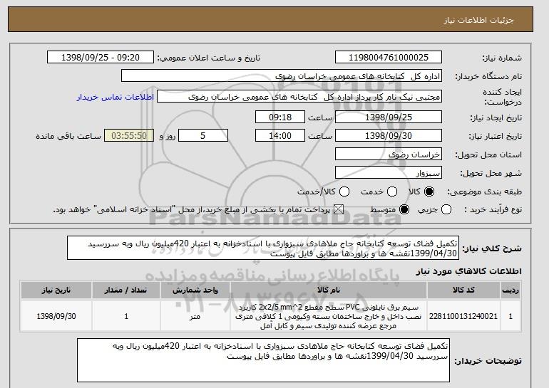 شرح کلی نیاز: تکمیل فضای توسعه کتابخانه حاج ملاهادی سبزواری با اسنادخزانه به اعتبار 420میلیون ریال وبه سررسید 1399/04/30نقشه ها و براوردها مطابق فایل پیوست