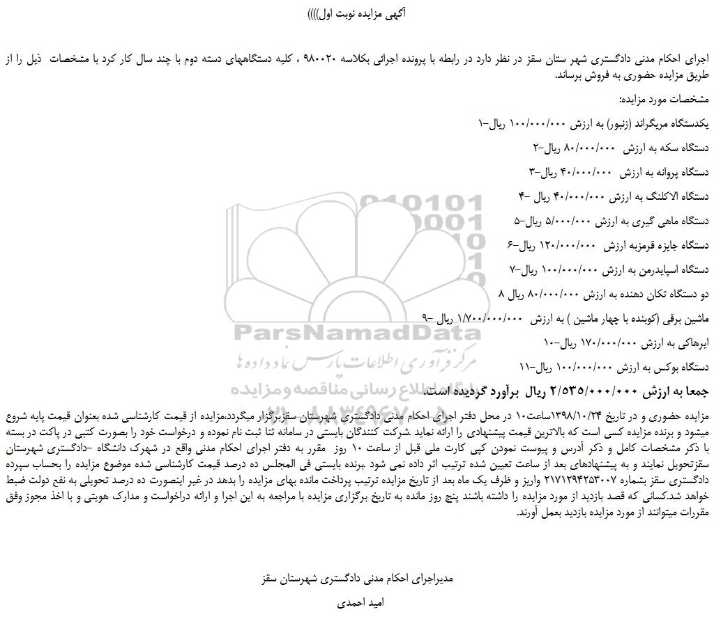 اجرای احکام مدنی دادگستری شهر ستان سقز در نظر دارد در رابطه با پرونده اجرائی بکلاسه 980020 ، کلیه دستگاههای دسته دوم با چند سال کار کرد با مشخصات ذیل را از طریق مزایده حضوری به فروش برساند.