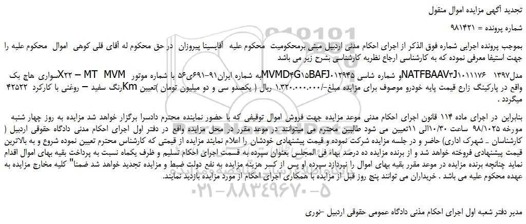 سواری هاج بک X22 – MT MVM به شماره ایران91-691ی56 با شماره موتور MVMD4G15BAFJ012945و شماره شاسی NATFBAAV3J1011176 مدل1397 رنگ سفید – روغنی با کارکرد 42522 Km واقع در پارکینگ زارع قیمت پایه خودرو موصوف برای مزایده مبلغ-/1.320.000.000 ریال ( یکصدو سی و دو میلیون تومان )تعیین میگردد .