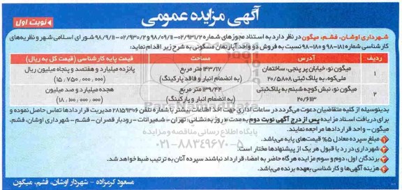 مزایده فروش دو واحد آپارتمان مسکونی نوبت اول