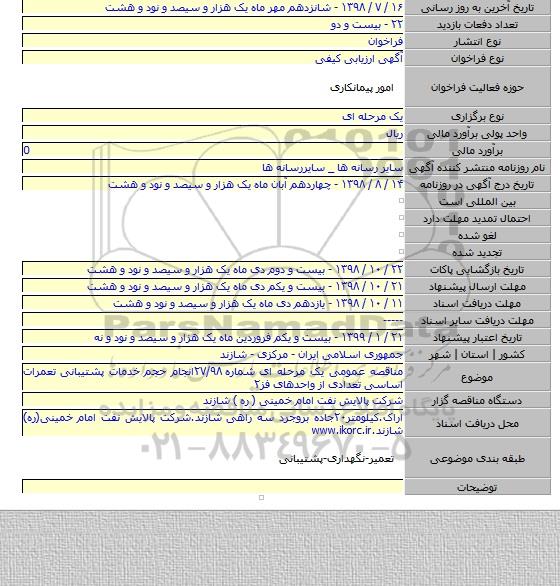 مناقصه عمومی یک مرحله ای شماره ۲۷/۹۸انجام حجم خدمات پشتیبانی تعمرات اساسی تعدادی از واحدهای فز۲