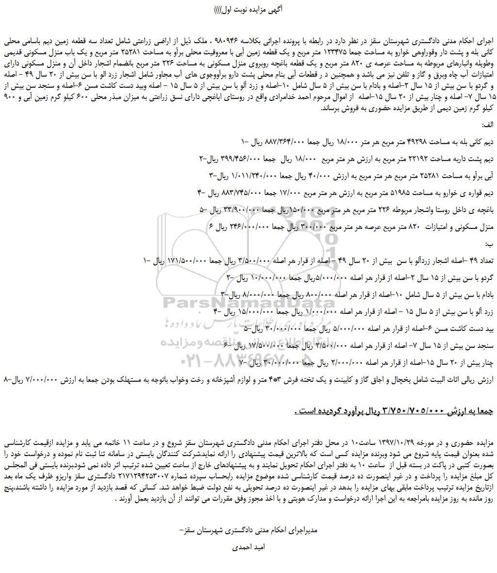 اجرای احکام مدنی دادگستری شهرستان سقز در نظر دارد در رابطه با پرونده اجرائی بکلاسه 980946 ، ملک ذیل از اراضی زراعتی شامل تعداد سه قطعه زمین دیم باسامی محلی کانی بله و پشت دار وقوراوهی خوارو به مساحت جمعا 123475 متر مربع و یک قطعه زمین آبی با معروفیت محلی برآو به مساحت 25281 متر مربع و یک باب منزل مسکونی قدیمی وطویله وانبارهای مربوطه به مساحت عرصه ی 820 متر مربع و یک قطعه باغچه روبروی منزل مسکونی به مساحت 226 متر مربع بانضمام اشجار داخل آن و منزل مسکونی دارای امتیازات آب چاه وبرق و گاز و تلفن نیز می باشد و همچنین د ر قطعات آبی بنام محلی پشت دارو برآووجوی های آب مجاور شامل اشجار زرد الو با سن بیش از 20 سال 49 - اصله و گردو با سن بیش از 15 سال 2-اصله و بادام با سن بیش از 5 سال شامل 10-اصله و زرد آلو با سن بیش از 5 سال 15 - اصله وبید دست کاشت مسن 6-اصله و سنجد سن بیش از 15 سال 7- اصله و چنار بیش از 20 سال 15-اصله  از اموال مرحوم احمد خدامرادی واقع در روستای ایاغچی دارای نسق زراعتی به میزان مبذر محلی 600 کیلو گرم زمین آبی و 900 کیلو گرم زمین دیمی از طریق مزایده حضوری به فروش برساند.