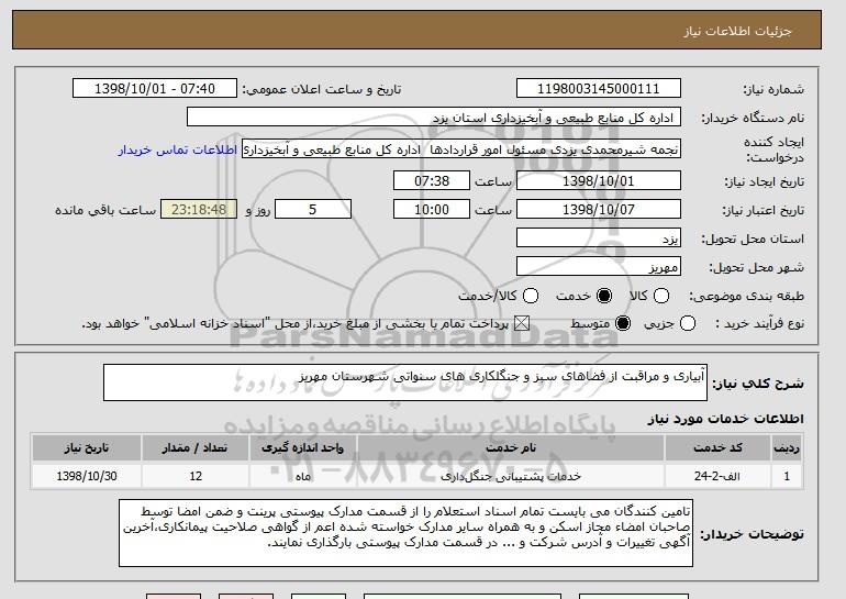 شرح کلی نیاز: آبیاری و مراقبت از فضاهای سبز و جنگلکاری های سنواتی شهرستان مهریز