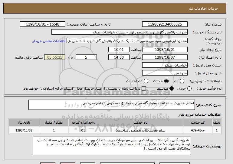 شرح کلی نیاز: انجام تعمیرات ساختمان نمایشگاه مرکزی مجتمع مسکونی مهاجر سرخس