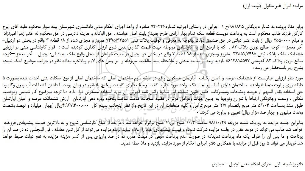 برابر مفاد پرونده به شمار ه بایگانی 981845/ج 1 اجرایی در راستای اجرائیه شماره940446 صادره از واحد اجرای احکام مدنی دادگستری شهرستان بیله سوار محکوم علیه آقای ایرج کارکن فرزند طالب محکوم است به پرداخت دویست قطعه سکه تمام بهار آزادی طرح جدیداز بابت اصل خواسته . حق الوکاله و هزینه دادرسی در حق محکوم له خانم زهرا امیرنژاد و مبلغ 2550000 ریال از بابت عشر دولتی در حق صندوق دولت .باتوجه به معرفی و توقیف پلاک ثبتی 7495/32551 مفروز و مجزی شده از 18 قطعه 3 واقع در بخش دو اردبیل- آخر معجز - کوچه صالح نوری پلاک 82 . که با ارجاع آن به کارشناس مربوطه جهت قیمت گذاری بدین شرح ارزش گذاری گردیده است : قرار کارشناسی مبنی بر ارزیابی ششدانک ملک پلاک ثبتی 32551/7495 مفروز ومجزی شده از 18 قطعه 3 واقع در بخش دو اردبیل در معیت خواهان از محل وقوع ملک به نشانی: اردبیل- آخر معجز –کوچه صالح نوری پلاک 82 کدپستی 5614815597 بازدید وبعد از معاینه محلی و ملاحظه سند مالکیت مربوطه و بر رسی های لازم وبالاخره مداقه نظر در جوانب موضوع اینک نتیجه بشرح زیر باستحضار می رسد :