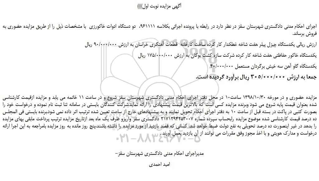 اجرای احکام مدنی دادگستری شهرستان سقز در نظر دارد در رابطه با پرونده اجرائی بکلاسه 961111،  دو دستگاه ادوات خاکورزی  با مشخصات ذیل را از طریق مزایده حضوری به فروش برساند.