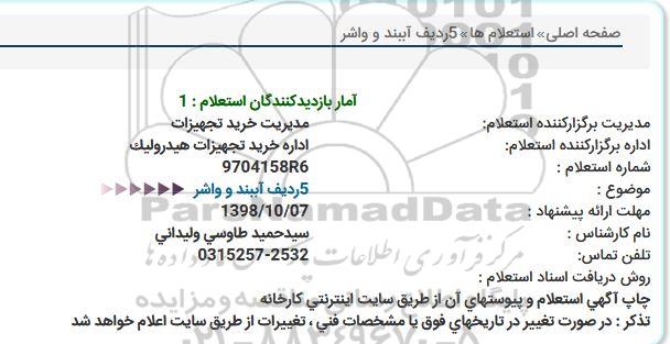اداره برگزارکننده استعلام: اداره خرید تجهیزات هیدرولیك