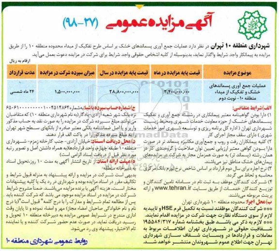 شهرداری منطقه 10 تهران در نظر دارد اجرای عملیات جمع آوری پسماندهای خشک براساس طرح تفکیک از مبدا محدوده منطقه 10 را از طریق مزایده به پیمانکار واجد شرایط واگذار نماید بدینوسیله از کلیه اشخاص حقوقی واجد شرایط برای شرکت در مزایده دعوت بعمل می آید