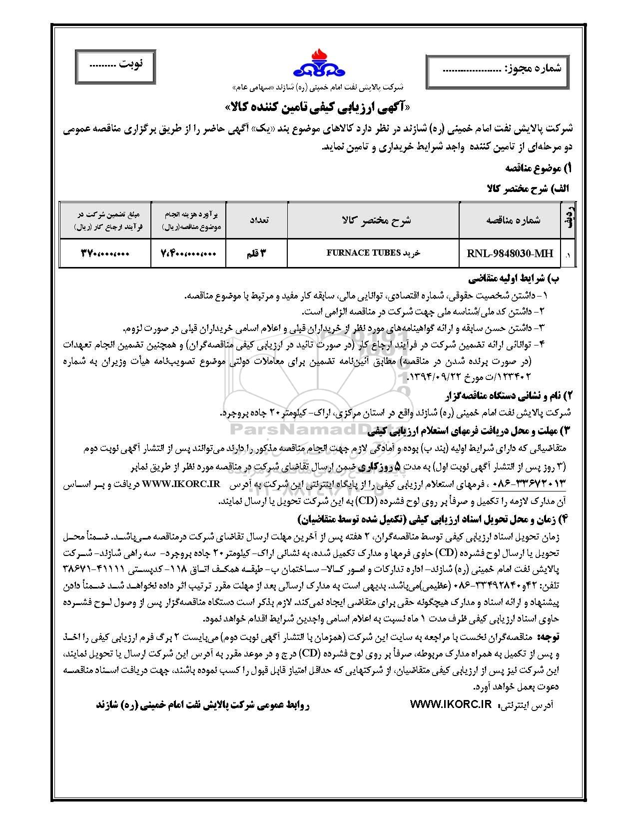ارزیابی کیفی خرید FURNACE TUBES از کلیه افراد متخصص و شرکتها واجد شرایط دعوت به عمل میآید در مناقصه با کد خبرگزاری پارس نماد: 2102874 شرکت نمایند.