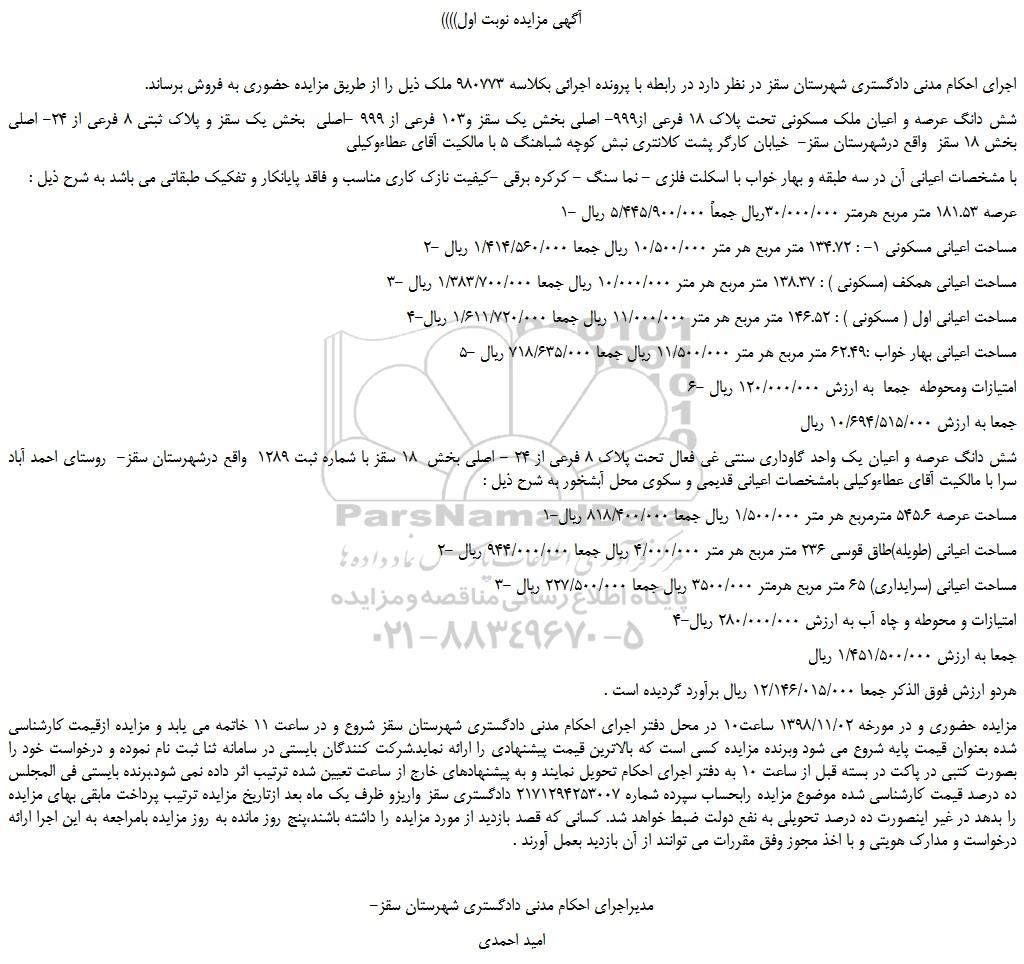 مزایده فروش شش دانگ عرصه و اعیان ملک مسکونی تحت پلاک 18 فرعی از999- اصلی , مزایده، مزایده فروش شش دانگ عرصه و اعیان ملک مسکونی تحت پلاک 18 فرعی از999- اصلی