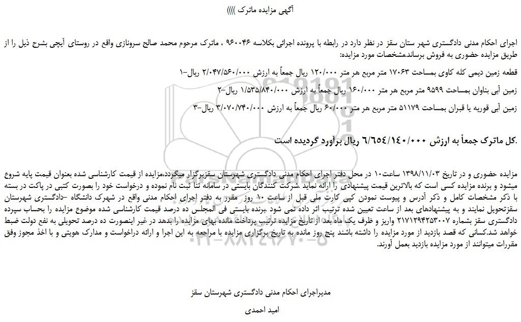 اجرای احکام مدنی دادگستری شهر ستان سقز در نظر دارد در رابطه با پرونده اجرائی بکلاسه 960046 ، ماترک مرحوم محمد صالح سرونازی واقع در روستای آیچی بشرح ذیل را از طریق مزایده حضوری به فروش برساند.مشخصات مورد مزایده:
