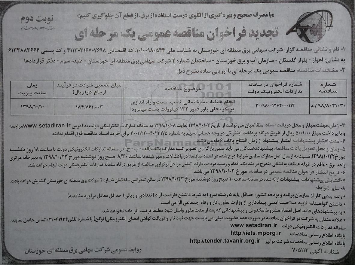 98/8021030/م 20098001262000114 انجام عملیات ساختمانی، نصب، تست و راه اندازی بریکر به جای پاور فیوز 132 کیلوولت پست میانرود 184.761.003