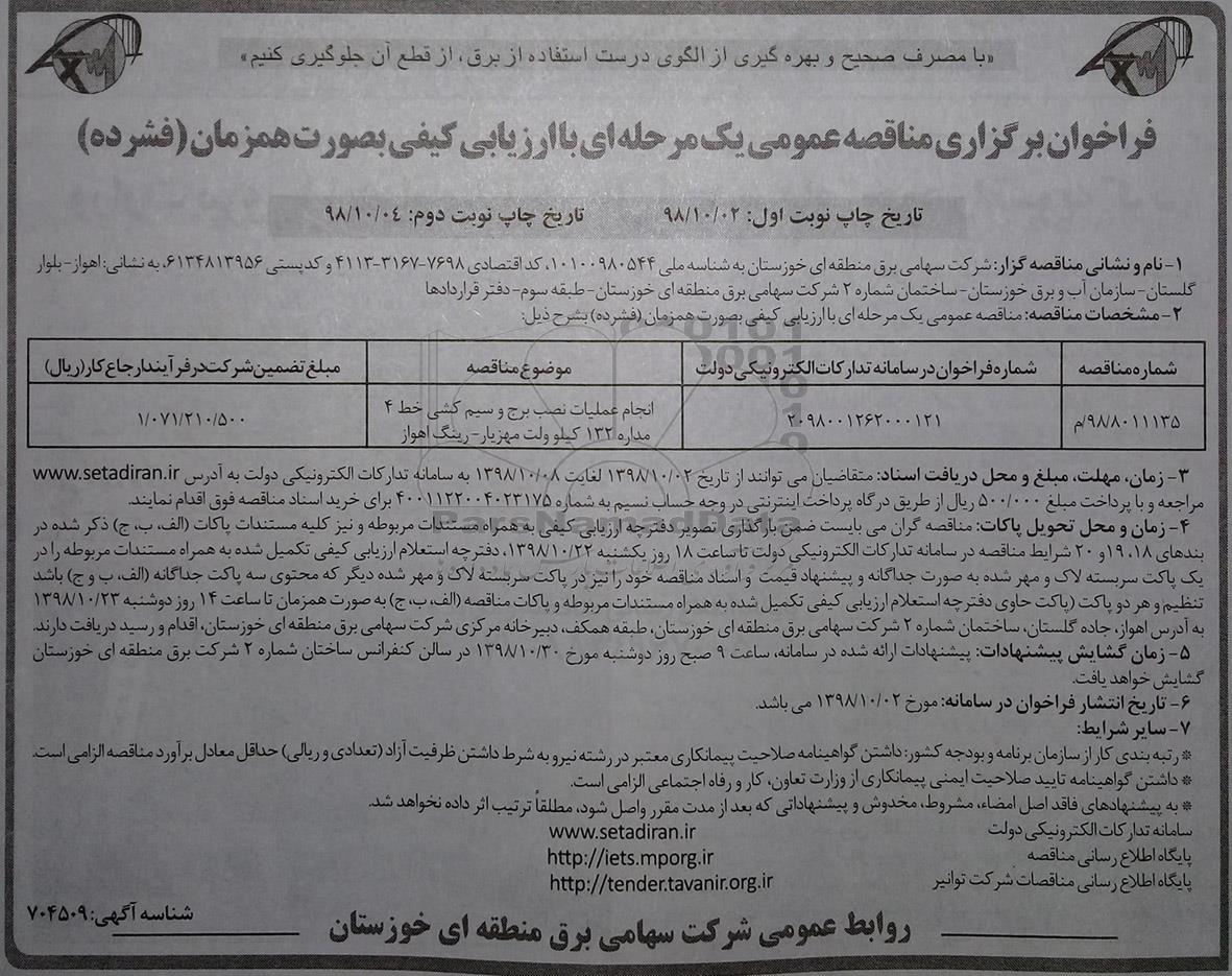 98/8011135/ م  2098001262000121 انجام عملیات نصب برج و سیم کشی خط 4 مداره 132 کیلوولت مهزیار - رینگ اهواز