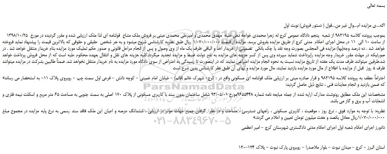 بموجب پرونده کلاسه 982195 از شعبه  پنجم دادگاه عمومی کرج له زهرا محمدی خواجه دهی علیه  مهدی محمدی و امیرعلی محمدی مبنی بر فروش ملک مشاع  قولنامه ای لذا ملک ارزیابی شده و مقرر گردیده در مورخ  1398/10/25  از ساعت 10 الی  11 در محل اجرای احکام  مدنی کرج از طریق مزایده بفروش برسد. مزایده از قیمت 1/070/000/000 ریال طبق نظریه کارشناسی شروع میشود و به هر شخص  حقیقی و حقوقی که بالاترین قیمت را پیشنهاد نماید فروخته خواهد شد . ده درصد وجه(بها) مزایده فی المجلس بصورت وجه نقد یا چک بانکی  تضمینی از خریدار اخذ و الباقی ظرف یک ماه از وی وصول و پس از انجام مراحل قانونی و صدور حکم تملیک مورد مزایده بنام خریدار منتقل خواهد شد . در صورتیکه در مهلت مقرر خریدار وجه مزایده راپرداخت ننماید سپرده وی پس از کسر هزینه های مزایده به نفع دولت ضبط و مزایده تجدید میگردد.کلیه هزینه های نقل و انتقال بعهده محکوم علیه است که از محل فروش پرداخت خواهد شد.طرفین میتوانند ظرف مدت یک هفته از تاریخ مزایده نسبت به نحوه انجام مزایده اعتراض نمایند که در اینصورت تا رسیدگی به اعتراض از سوی دادگاه مورد مزایده به نام خریدار منتقل نخواهد شد. ضمناً طالبین بشرکت در مزایده میتوانند ظرف 5 روز  قبل از مزایده با اطلاع از مال مورد مزایده بازدید نمایند. مال مورد مزایده و بهای آن طبق نظر کارشناس بدین شرح است