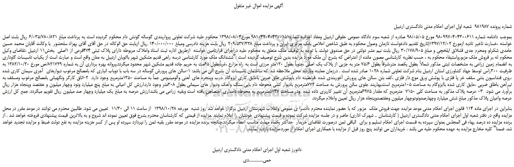 بموجب دادنامه شماره 9809970404300611 مورخ 98/05/05 صادره از شعبه سوم دادگاه عمومی حقوقی اردبیل ومفاد اجرائیه شماره9810420404300151 مورخ1398/08/04 محکوم علیه شرکت تعاونی پرواربندی گوساله گونش دام محکوم گردیده است به پرداخت مبلغ 6/035/780/821 ریال بابت اصل خواسته ،خسارت تاخیر تادیه ازمورخ 1397/12/02(تاریخ تقدیم دادخواست تازمان وصول محکوم به طبق شاخص اعلامی بانک مرکزی ایران و پرداخت مبلغ 209/537/328 ریال بابت هزینه دادرسی ومبلغ 140/000/000 ریال ازبابت حق الوکاله در حق آقای آقای بهزاد سلحشور  با وکالت آقایان محمد حسین حامدی شکرلو ومحرم جدی قشلاق ایلخچی و مبلغ 30/178/905 ریال بابت نیم عشر دولتی در حق صندوق دولت. با توجه به توقیف ملک متعلق به محکوم علیه دراجرای قرارتامین خواسته  ازطریق اداره ثبت اسناد واملاک مربوطه دارای پلاک ثبتی 474فرعی از 1اصلی  بخش11 اردبیل ،تقاضای وکیل محکوم له بر فروش ملک مزبورواستیفاء محکوم به ، حسب نظریه کارشناسی مصون مانده از اعتراض که بشرح آن ملک مورد مزایده بدین شرح توصیف گردیده است :"ششدانگ ملک مورد کارشناسی درسه راهی قدیم مشکین شهر بااتوبان اردبیل به مغان واقع است و عبارت است از یکباب تاسیسات گاوداری به انضمام زمین زراعی به مشخصات ثبتی مذکور شمالاً بطول یکصد متر،شرقاً بطول 75/6 متر به جزیی از پلاک یک اصلی ،جنوباً بطول 120متر مرزی است به راه مزارع ،غرباًبطول 65مت به حریم جاده قدیم مشکین شهر محدود میگردد.پروانه بهره برداری آن به شماره 821729/ص مورخ 1382/10/20 به ظرفیت 300راس توسط جهاد کشاورزی استان اردبیل بنام شرکت تعاونی شماره 1028 صادر شده است . درزمان معاینه وبازدید محلی ملاحظه شد که ساختمان تاسیسات آن بشرح آتی می باشد: 1-سالن های پرورش گوساله در سه باب با دوباب انباری که بامصالح مرغوب دیوارهای  آجری سیمان کاری شده ،روی فنداسیون بتنی سقف خر پا فلزی با پوشش ورق موج دار فلزی ،کف بتن ،سالن های پرورش آخوربندی شده ،قرنطینه دام باپوشش طاق ضربی باعایق کاری ایزوگام ،درب وپنجره های آهنی وآلومینیومی جماً به مساحت 1350مترمربع وجود دارد.  2-اتاق کارگر ونگهبانی بامصالح مرغوب ومسقف به تیرآهن باطاق ضربی ،عایق کاری شده باایزوگام به مساحت 105مترمربع است.بهاربند جلوی سالن پرورش به مساحت 772مترمربع بادیوار کشی محوطه دام باپی سنگ وآهک ودیوار های سیمانی بطول 308متر وجود دارد.ارزش کل اعیانی به مبلغ پنج میلیارد ونود وچهار میلیون و هفتصد وپنجاه هزار ریال برآورد می شود.  3- عرصه پلاک مذکور به مساحت کلی 7150  مترمربع که مقدار 6975مترمربع آن تغییر کاربری داده شده  ودر مساحت 5747مترمربع به محوطه دامداری اختصاص یافته است وبقیه زراعی می باشد.ارزش عرصه به مبلغ یک میلیارد وچهار صد میلیون ریال تقویم میگردد. جمع کل ارزش عرصه واعیان پلاک مذکور مبلغ شش میلیارد وچهارصدونودوچهار میلیون وهفتصدوپنجاه هزار ریال تعیین واعلام میگردد.