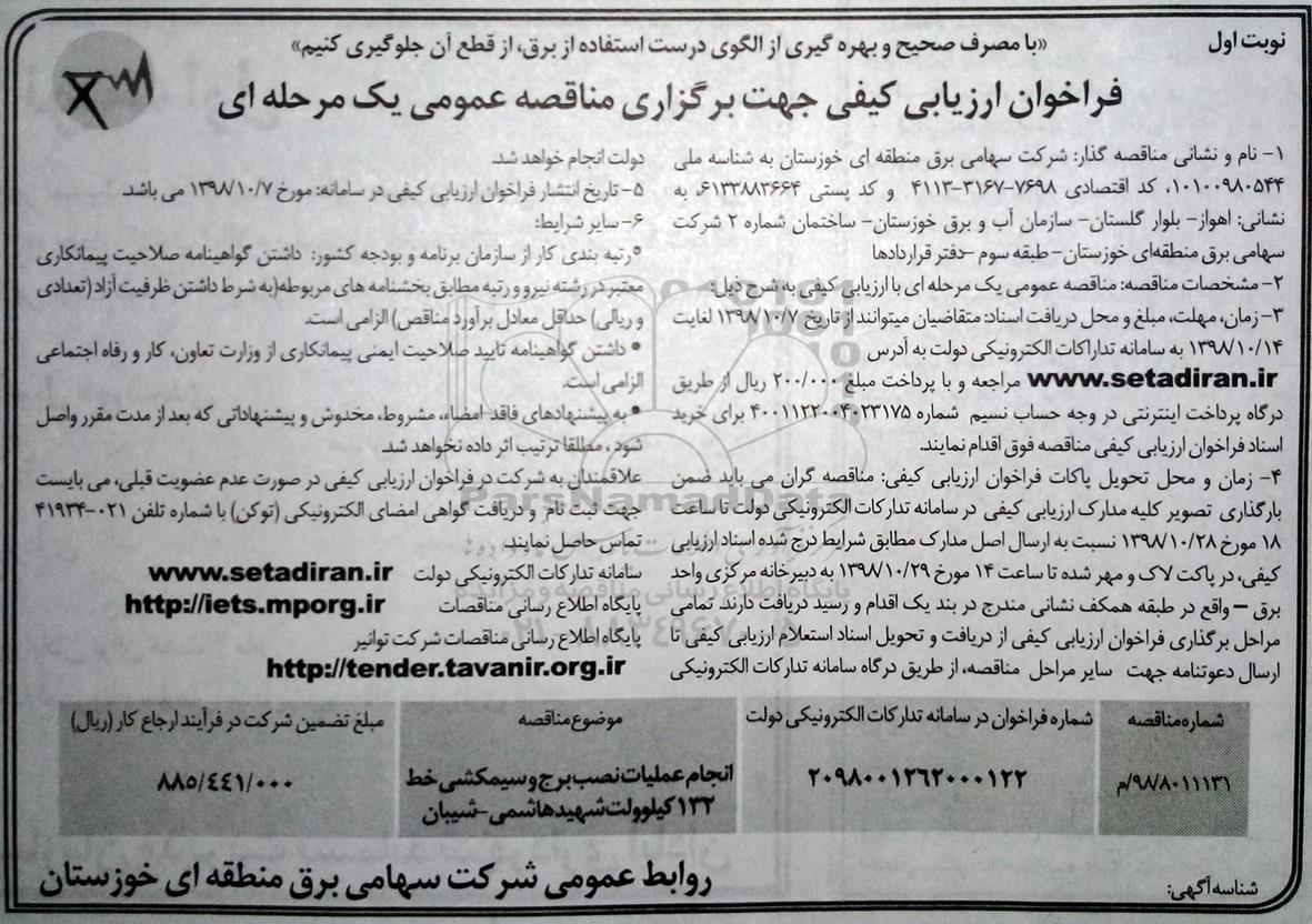 فراخوان مناقصه انجام عملیات نصب برج و سیم کشی خط 132 کیلوولت , فراخوان ارزیابی کیفی , فراخوان مناقصه انجام عملیات نصب برج و سیم کشی خط 132 کیلوولت