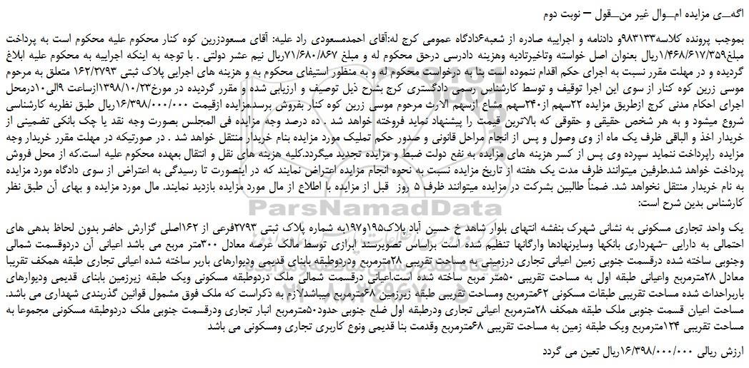 بموجب پرونده کلاسه983133و دادنامه و اجراییه صادره از شعبه6دادگاه عمومی کرج له:آقای احمدمسعودی راد علیه: آقای مسعودزرین کوه کنار محکوم علیه محکوم است به پرداخت مبلغ1/468/617/359ریال بعنوان اصل خواسته وتاخیرتادیه وهزینه دادرسی درحق محکوم له و مبلغ 71/680/867ریال نیم عشر دولتی . با توجه به اینکه اجراییه به محکوم علیه ابلاغ گردیده و در مهلت مقرر نسبت به اجرای حکم اقدام ننموده است بنا به درخواست محکوم له و به منظور استیفای محکوم به و هزینه های اجرایی پلاک ثبتی 162/2793 متعلق به مرحوم موسی زرین کوه کنار از سوی این اجرا توقیف و توسط کارشناس رسمی دادگستری کرج بشرح ذیل توصیف و ارزیابی شده و مقرر گردیده در مورخ1398/10/23ازساعت 9الی10درمحل اجرای احکام مدنی کرج ازطریق مزایده 22سهم از240سهم مشاع ازسهم الارث مرحوم موسی زرین کوه کنار بفروش برسد.مزایده ازقیمت 16/398/000/000ریال طبق نظریه کارشناسی شروع میشود و به هر شخص حقیقی و حقوقی که بالاترین قیمت را پیشنهاد نماید فروخته خواهد شد . ده درصد وجه مزایده فی المجلس بصورت وجه نقد یا چک بانکی تضمینی از خریدار اخذ و الباقی ظرف یک ماه از وی وصول و پس از انجام مراحل قانونی و صدور حکم تملیک مورد مزایده بنام خریدار منتقل خواهد شد . در صورتیکه در مهلت مقرر خریدار وجه مزایده راپرداخت ننماید سپرده وی پس از کسر هزینه های مزایده به نفع دولت ضبط و مزایده تجدید میگردد.کلیه هزینه های نقل و انتقال بعهده محکوم علیه است.که از محل فروش پرداخت خواهد شد.طرفین میتوانند ظرف مدت یک هفته از تاریخ مزایده نسبت به نحوه انجام مزایده اعتراض نمایند که در اینصورت تا رسیدگی به اعتراض از سوی دادگاه مورد مزایده به نام خریدار منتقل نخواهد شد. ضمناً طالبین بشرکت در مزایده میتوانند ظرف 5 روز قبل از مزایده با اطلاع از مال مورد مزایده بازدید نمایند. مال مورد مزایده و بهای آن طبق نظر کارشناس بدین شرح است: