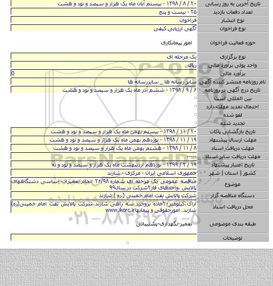 مناقصه عمومی یک مرحله ای شماره ۲۶/۹۸ انجام تعمیرات اساسی دشتگاههای پالایش .واحدهای فاز۲شرکت در سال۹۹