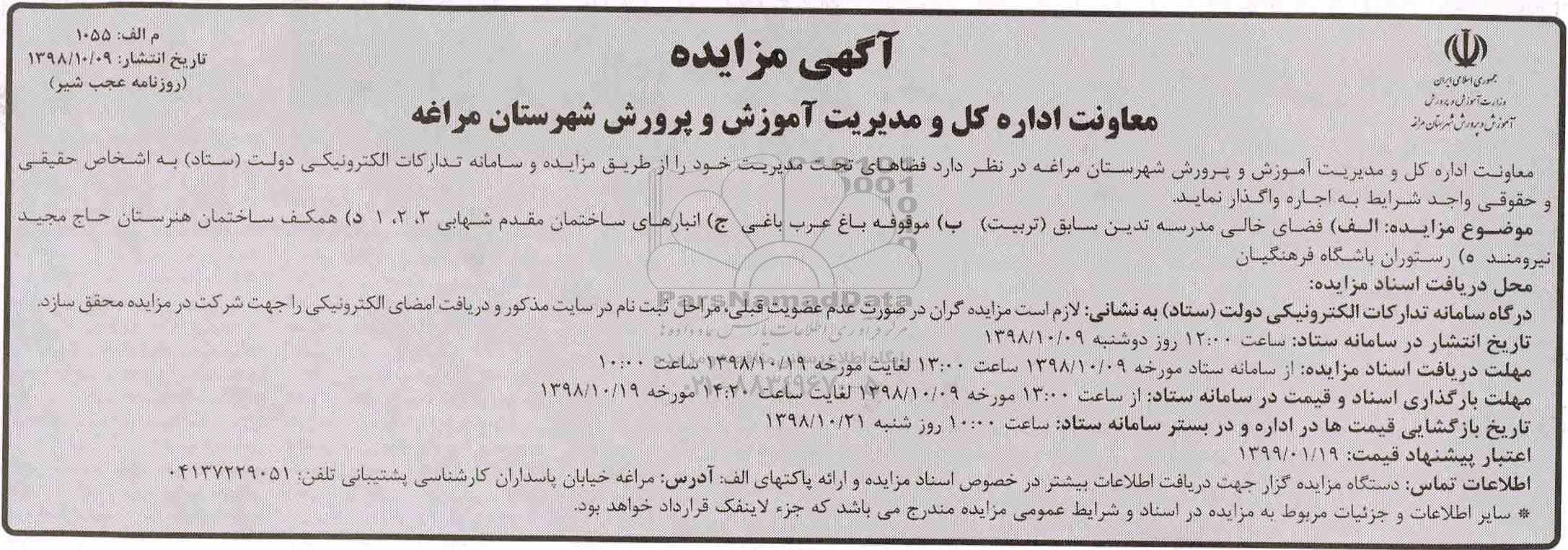 معاونت اداره کل و مدیریت آموزش و پرورش شهرستان مراغه در نظر دارد فضاهای تحت مدیریت خود را طریق مزایده و سامانه تدارکات الکترونیکی دولت ستاد به اشخاص حقیقی و حقوقی واجد شرایط به اجاره واگذار نماید