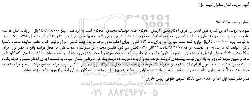 بموجب پرونده اجرایی شماره فوق الذکر از اجرای احکام مدنی اردبیل محکوم علیه هوشنگ مجیدی محکوم است به پرداخت مبلغ 450/468/000ریال از بابت اصل خواسته بعلاوه سایر هزینه ها در حق آقای ساسان ابراهیمی ، محکوم له اموال محکوم علیه که به شرح زیر می باشد خودرو ام وی ام بشماره 21ی329 ایران 91 مدل 1396 رنگ سفید به قیمت پایه 650/000/000ریال براورد شده است بنابراین در اجرای ماده 114 قانون اجرای احکام مدنی موعد مزایده جهت فروش اموال توقیفی که با حضور نماینده محترم دادسرا برگزار خواهد شد مزایده به روز دوشنبه مورخه 98/11/07ساعت 111الی 10/30تعیین می شود طالبین محترم می میتوانند در موعد مقرر در محل مزایده واقع در دفتر اول اجرای احکام مدنی دادگاه حقوقی اردبیل ( کارشناسان ـ شهرک اداری) حاضر و در جلسه مزایده شرکت نموده و قیمت پیشنهادی خودشان را اعلام نمایند مزایده از قیمتی که کارشناس محترم تعیین نموده شروع و به بالاترین قیمت پیشنهادی فروخته خواهد شد و از برنده مزایده ده درصد بهاء فی المجلس بعنوان سپرده به قسمت اجرای احکام تسلیم و ظرف یکماه نسبت به پرداخت بقیه بهای اموال اقدام نماید چنانچه برنده مزایده در موعد مقرر بقیه بهای اموال را نپردازد سپرده او پس از کسر هزینه مزایده به نفع دولت ضبط و مزایده تجدید خواهد شد ضمنا" کلیه مخارج مزایده به عهده محکوم علیه می باشد . خریداران می توانند پنج روز قبل از مزایده با همکاری اجرای احکام از مورد مزایده بازدید نمایند.