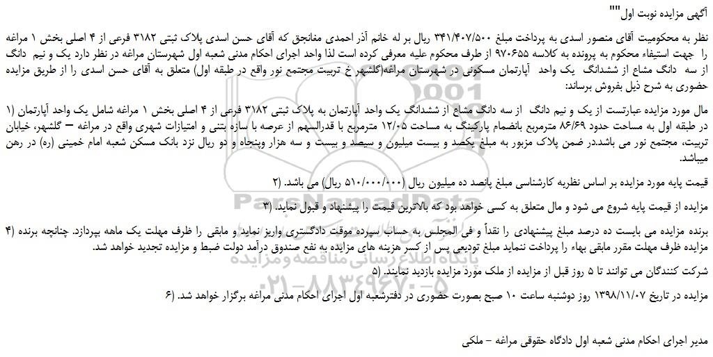 نظر به محکومیت آقای منصور اسدی به پرداخت مبلغ 341/407/500 ریال بر له خانم آذر احمدی مغانجق که آقای حسن اسدی پلاک ثبتی 3182 فرعی از 4 اصلی بخش 1 مراغه را جهت استیفاء محکوم به پرونده به کلاسه 970655 از طرف محکوم علیه معرفی کرده است لذا واحد اجرای احکام مدنی شعبه اول شهرستان مراغه در نظر دارد یک و نیم دانگ از سه دانگ مشاع از ششدانگ یک واحد آپارتمان مسکونی در شهرستان مراغه(گلشهر خ تربیت مجتمع نور واقع در طبقه اول) متعلق به آقای حسن اسدی را از طریق مزایده حضوری به شرح ذیل بفروش برساند:
