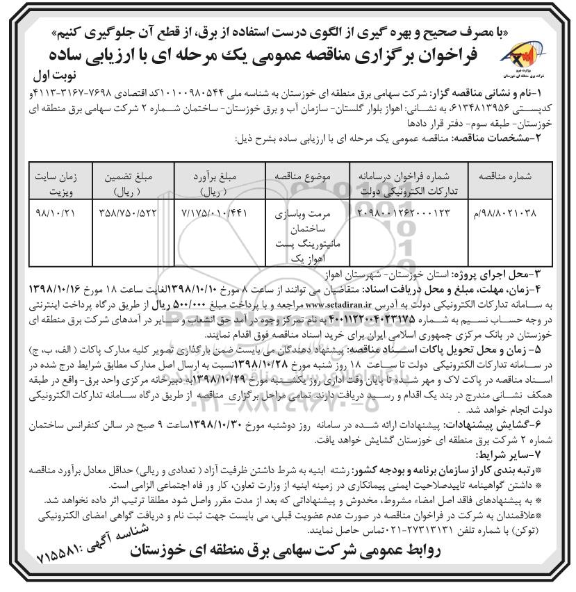 | م/98/8021038 | 2098001262000123 | مرمت و بازسازی ساختمان مانیتورینگ پست اهواز یک |