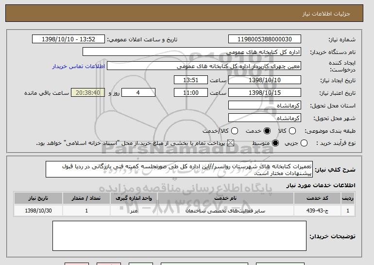 شرح کلی نیاز: تعمیرات کتابخانه های شهرستان روانسر//این اداره کل طی صورتجلسه کمیته فنی بازرگانی در ردیا قبول پیشنهادات مختار است.