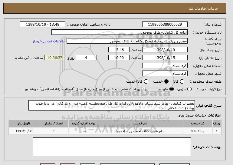 شرح کلی نیاز: تعمیرات کتابخانه های شهرستان دالاهو//این اداره کل طی صورتجلسه کمیته فنی و بازرگانی در رد یا قبول پیشنهادات مختار است