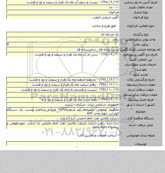 مناقصه عمومی دومرحله ای شماره۳۸/۹۸ طراحی٫ساخت وتست یک دستگاه کولرآبی جهت واحد KHT