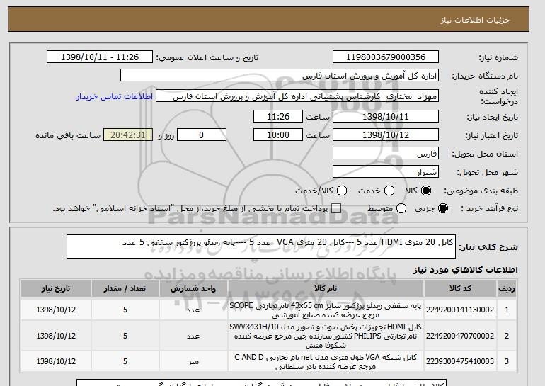 شرح کلی نیاز: کابل 20 متری HDMI عدد 5 ---کابل 20 متری VGA عدد 5 ----پایه ویدئو پروژکتور سقفی 5 عدد