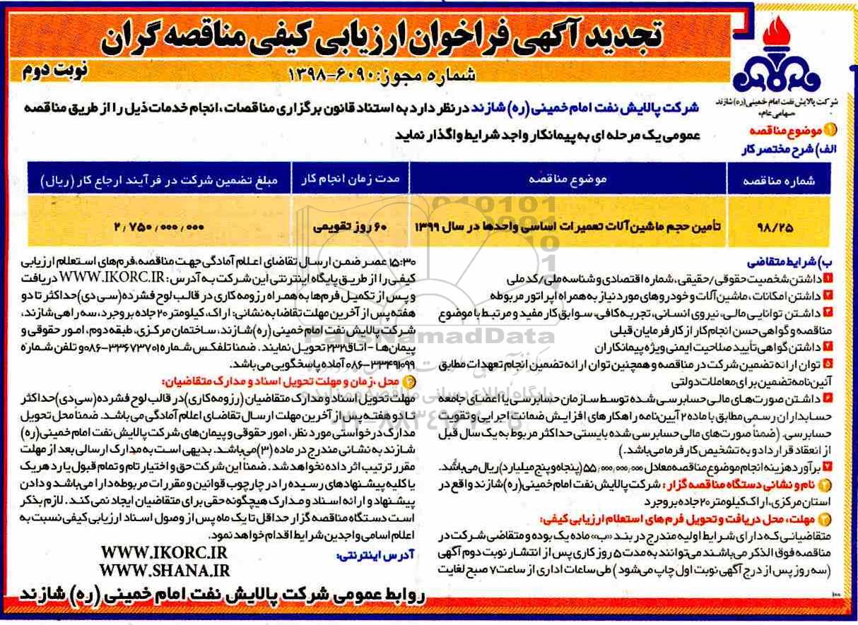تجدید فراخوان ارزیابی کیفی تامین حجم ماشین آلات تعمیرات اساسی واحدها- نوبت دوم , تجدید فراخوان ارزیابی کیفی، تجدید فراخوان ارزیابی کیفی تامین حجم ماشین آلات تعمیرات اساسی واحدها- نوبت دوم