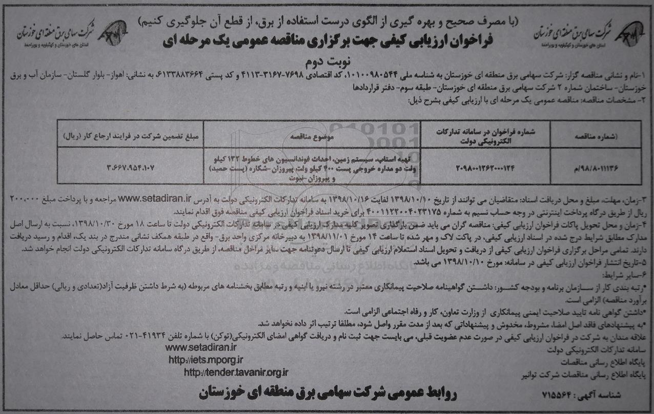| 98/8011136/ م | 2098001262000124 | تهیه استاپ ، سیستم زمین ، احداث فوندانسیون های خطوط 132 کیلوولت دو مداره خروجی پست 400 کیلوولت پیروزان - شکاره پست حمید و پیروزان نبوت | 3.677.954.107 |