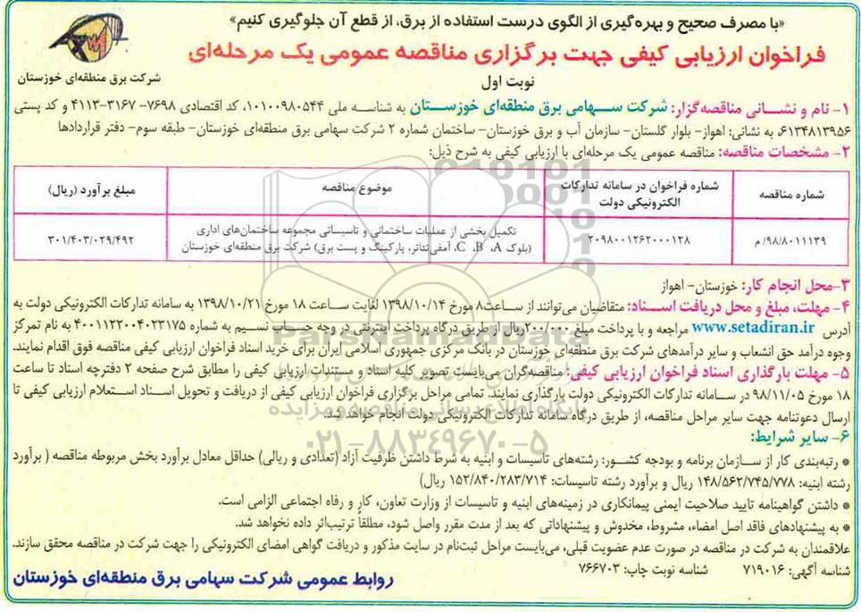 8011139 / 98/ م  2098001262000128 تکمیل بخشی از عملیات ساختمانی و تاسیساتی مجموعه ساختمان های اداری بلوک A, B, C  آمفی تئاتر ، پارکینگ ، و پست برق شرکت برق منطقه ای خوزستان  301.403.029.492