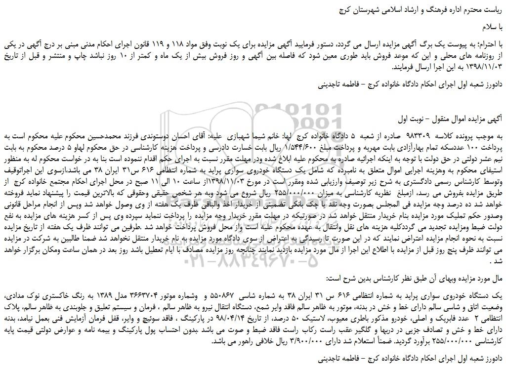 به موجب پرونده کلاسه  983309  صادره از شعبه  5 دادگاه خانواده کرج  لها: خانم شیما شهبازی  علیه: آقای احسان دوستوندی فرزند محمدحسین محکوم علیه محکوم است به پرداخت 100 عددسکه تمام بهارآزادی بابت مهریه و پرداخت مبلغ 1/544/600 ریال بابت خسارت دادرسی و پرداخت هزینه کارشناسی در حق محکوم لهاو 5 درصد محکوم به بابت نیم عشر دولتی در حق دولت با توجه به اینکه اجرائیه صادره به محکوم علیه ابلاغ شده ودر مهلت مقرر نسبت به اجرای حکم اقدام ننموده است بنا به در خواست محکوم له به منظور استیفای محکوم به وهزینه اجرایی اموال متعلق به نامبرده که شامل یک دستگاه خودروی سواری پراید به شماره انتظامی 616 س31 ایران 38 می باشد،ازسوی این اجراتوقیف وتوسط کارشناس رسمی دادگستری به شرح زیر توصیف وارزیابی شده ومقرر است در مورخ 1398/11/03از ساعت 10 الی 11 صبح در محل اجرای احکام مجتمع خانواده کرج  از طریق مزایده بفروش می رسد، ازمبلغ  نظریه کارشناسی به میزان 255/000/000 ریال شروع می شود وبه هر شخص حقیقی وحقوقی که بالاترین قیمت را پیشنهاد نماید فروخته خواهد شد ده درصد وجه مزایده فی المجلس بصورت وجه نقد یا چک بانکی تضمینی از خریدار اخذ والباقی ظرف یک هفته از وی وصول خواهد شد وپس از انجام مراحل قانونی وصدور حکم تملیک مورد مزایده بنام خریدار منتقل خواهد شد در صورتیکه در مهلت مقرر خریدار وجه مزایده را پرداخت ننماید سپرده وی پس از کسر هزینه های مزایده به نفع دولت ضبط ومزایده تجدید می گرددکلیه هزینه های نقل وانتقال به عهده محکوم علیه است واز محل فروش پرداخت خواهد شد .طرفین می توانند ظرف یک هفته از تاریخ مزایده نسبت به نحوه انجام مزایده اعتراض نمایند که در این صورت تا رسیدگی به اعتراض از سوی دادگاه مورد مزایده به نام خریدار منتقل نخواهد شد ضمنا طالبین به شرکت در مزایده می توانند ظرف پنج روز قبل از مزایده با اطلاع این اجرا از مال مورد مزایده بازدید نمایند چنانچه روز مزایده مصادف با ایام تعطیل باشد روز بعد در همان ساعت ومکان برگزار خواهد شد .