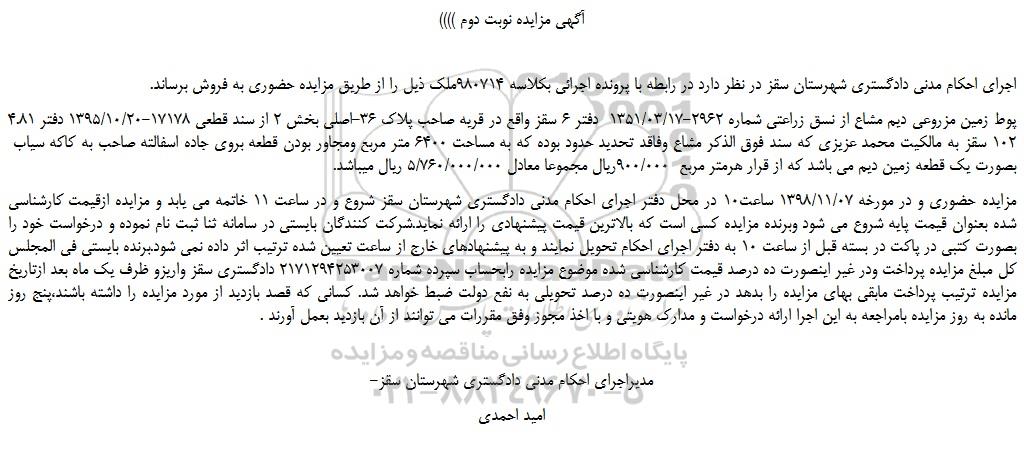 اجرای احکام مدنی دادگستری شهرستان سقز در نظر دارد در رابطه با پرونده اجرائی بکلاسه 980714ملک ذیل را از طریق مزایده حضوری به فروش برساند.