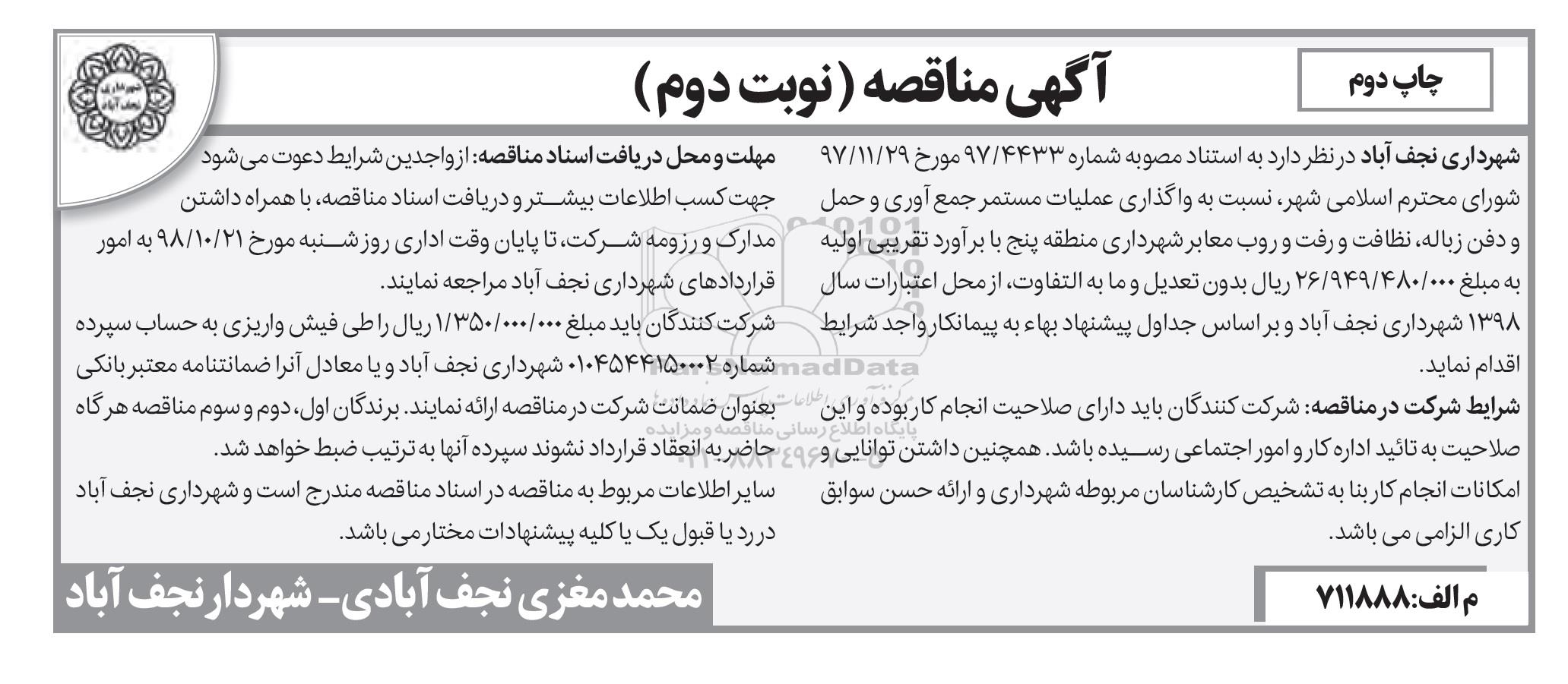 سایر اطلاعات مربوط به مناقصه در اسناد مناقصه مندرج است و شهرداری نجف آباد در رد یا قبول یک یا کلیه پیشنهادات مختار می باشد