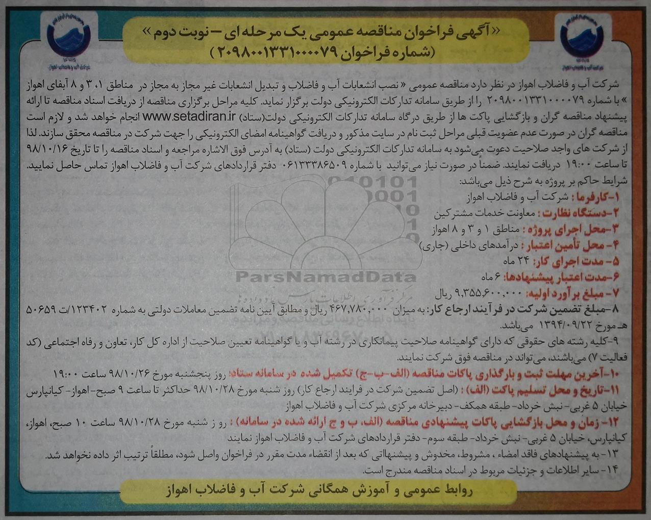 شرکت آب و فاضلاب اهواز در نظر دارد پروژه ‹‹ نصب انشعابات آب و فاضلاب و تبدیل انشعابات غیرمجاز به مجاز در مناطق 1، 3 و 8 آبفای اهواز با شماره 2098001331000079 را از طریق سامانه ت دارکات الکترونیکی دولت برگزار نماید. کلیه مراحل برگزاری مناقصه از دریافت اسناد مناقصه تا ارائه پیشنهاد مناقصه گران و بازگشایی پاکت ها از طریق درگاه سامانه تدارکات الکترونیکی دولت (ستاد)به آدرس ستاد انجام خواهد شد و لازم است مناقصه گران در صورت عدم عضویت قبلی، مراحل ثبت نام در سایت مذکور و دریافت گواهینامه امضای الکترونیکی را جهت شرکت د رمناقصه محقق سازند. لذا از شرکتهای واجد صلاحیت دعوت می شود ،به سامانه تدارکات الکترونیکی دولت (ستاد) به آدرس فوق الاشاره مراجعه و اسناد مناقصه را تا تاریخ 98.10.16 ساعت 19 دریافت نمایند
