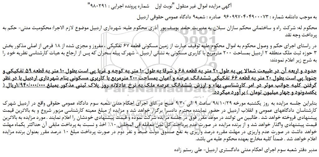 "آگهی مزایده اموال غیر منقول "نوبت اول    شماره پرونده اجرایی : 980291