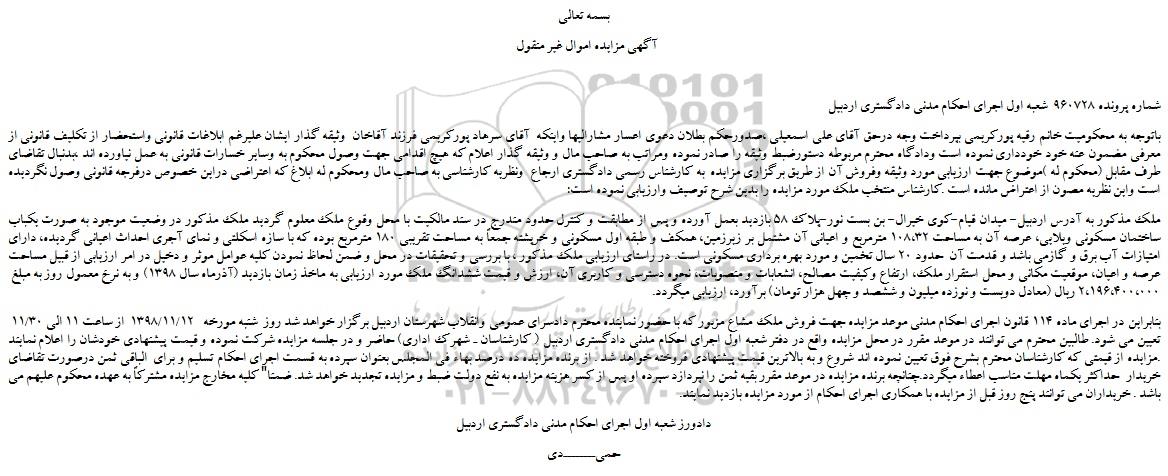 بنابراین در اجرای ماده 114 قانون اجرای احکام مدنی موعد مزایده جهت فروش ملک مشاع مزبور که با حضور نماینده محترم دادسرای عمومی وانقلاب شهرستان اردبیل برگزار خواهد شد روز  شنبه مورخه   1398/11/12  از ساعت 11 الی 11/30  تعیین می شود. طالبین محترم می توانند در موعد مقرر در محل مزایده واقع در دفتر شعبه اول اجرای احکام مدنی دادگستری اردبیل ( کارشناسان ـ شهرک اداری) حاضر و در جلسه مزایده شرکت نموده و قیمت پیشنهادی خودشان را اعلام نمایند .مزایده از قیمتی که کارشناسان محترم بشرح فوق تعیین نموده اند شروع و به بالاترین قیمت پیشنهادی فروخته خواهد شد . از برنده مزایده ده درصد بهاء فی المجلس بعنوان سپرده به قسمت اجرای احکام تسلیم و برای  الباقی ثمن درصورت تقاضای خریدار  حداکثر یکماه مهلت مناسب اعطاء میگردد.چنانچه برنده مزایده در موعد مقرر بقیه ثمن را نپردازد سپرده او پس از کسر هزینه مزایده به نفع دولت ضبط و مزایده تجدید خواهد شد. ضمنا" کلیه مخارج مزایده مشترکاً به عهده محکوم علیهم می باشد . خریداران می توانند پنج روز قبل از مزایده با همکاری اجرای احکام از مورد مزایده بازدید نمایند.